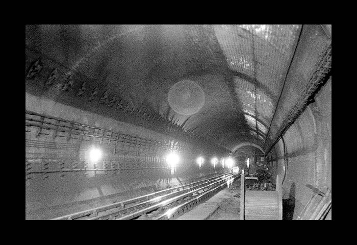 The crossover/siding beyond the western end of the platforms. This view is looking west with the siding on the left and the eastbound running tunnel on the right. (photo: 2013 by Andy Goldberg. ©2013) |