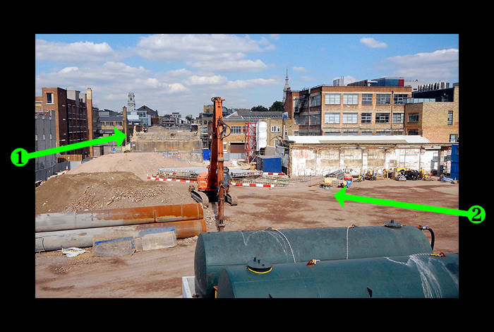 ![]() 2007 view from the same bit of viaduct as the above photo but this time looking north: 2) Points to the area that the new bridge from the East London Line will be located. |