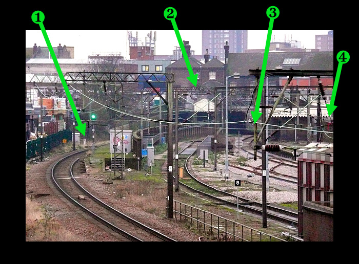 The eastbound platform with the staircase and canopy for the westbound platform arrowed. (photo: 2010) |