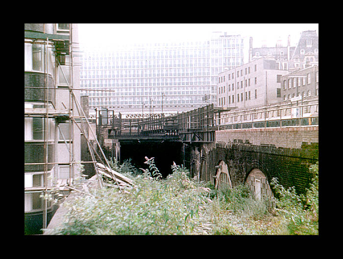 ![]() Northward view of the other end of the tunnel, rising to the surface north of Ludgate Hill in the late 1970s when the Snow Hill tunnel was reopened for through services. The intermediate station at Snow Hill (closed in 1916) still has some remains, visible from Thameslink trains travelling between Farringdon and City Thameslink stations. The viaduct on the right of the photos carries the (then) existing line to Holborn Viaduct terminus, the ticket office of which was housed in the office block visible in the photo above the tunnel entrance. (Photo ©2005. Simon Foster) |