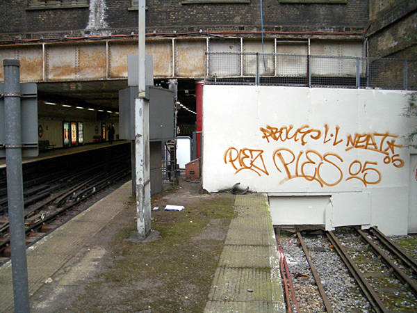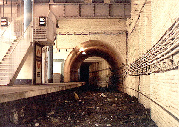![]() The disused terminating platform at Liverpool Street station on the Met/H&C/Circle lines, facing the other way (toward Moorgate). The space seen here has been given over to Crossrail. (photo: 2005) |