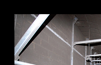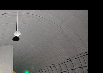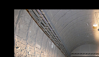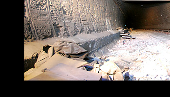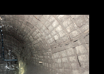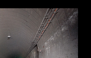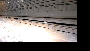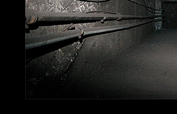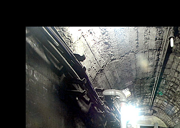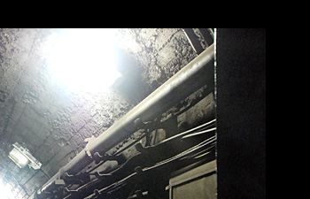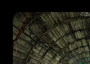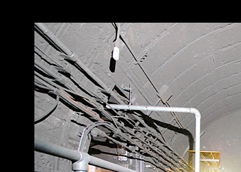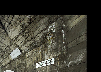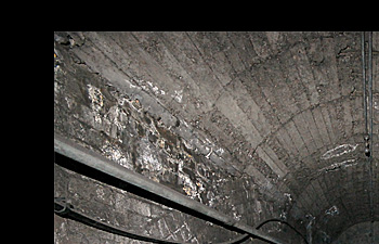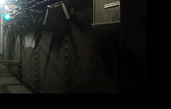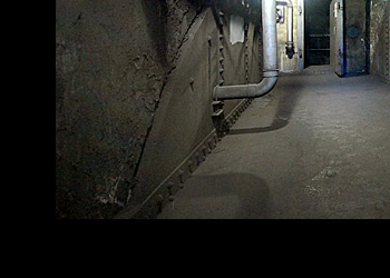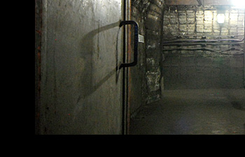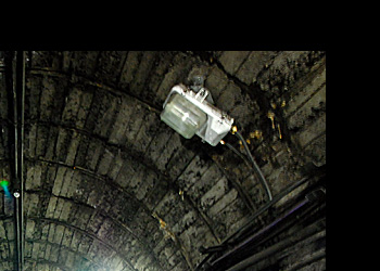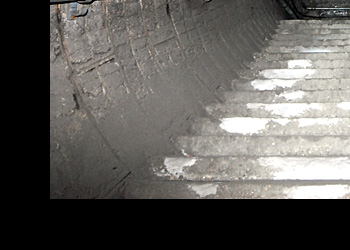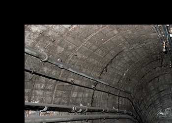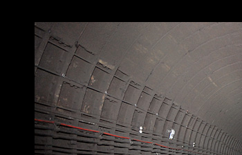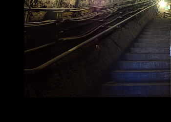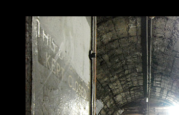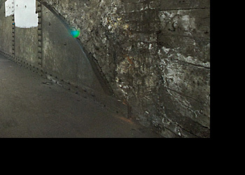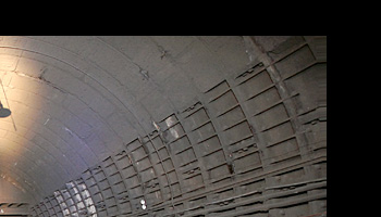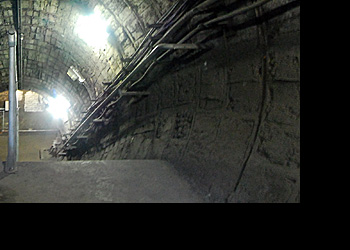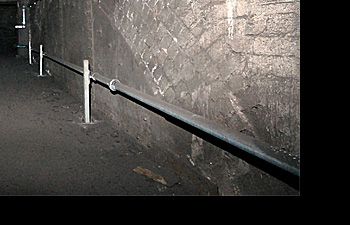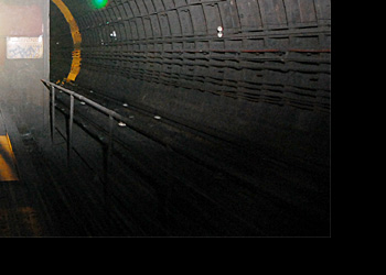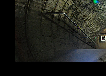 Crossing over the southbound platform. The passageway curves to the right at the end but is sealed off just out of sight of the cameras position. (photo: 2009) |