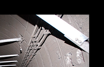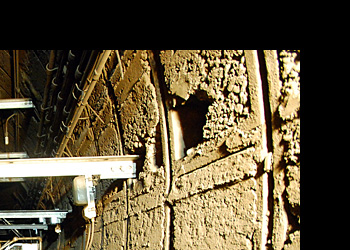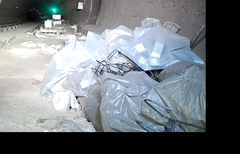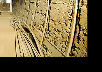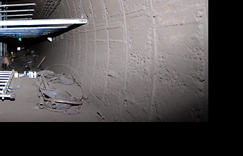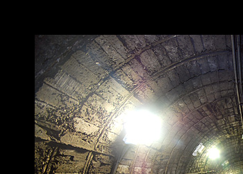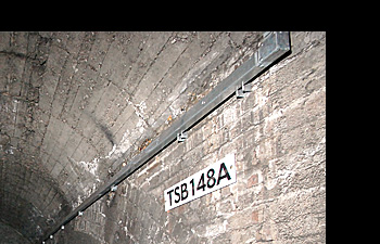 The northbound 'platform'. This station is unique amongst the disused stations in that it was never opened to the public. The work carried out on it hadn't reached the point of fitting out the station; the tunnel wall on the right has not been tiled. The wall on the left is a partition separating the track from the platform area. (photo: 2009) |