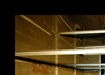 Progressing further along the northbound platform in a northerly direction, this photo is looking back at the partitioned area and also, in the foreground, a section of railed platform. The arc of light that can be seen on the track area (directly below the lamp suspended from the ceiling) is a small section just prior to the partitioned section where the track is visible. (photo: 2009) |