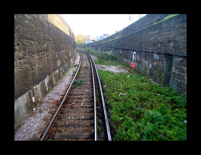 Photo showing the descent into Connaught Tunnel from the south side (Silvertown). To the left of the tracks are some barely visible sleepers: these are the remains of the tracks that continued along the surface to the swing bridge over the dock. (photo: Kevin Lane, from his Flickr site, reproduced with permission.) |
