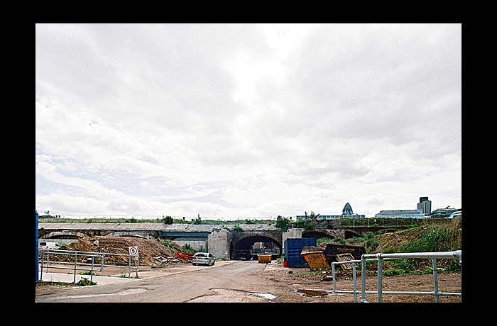2010: the cutting that Shoreditch station was in has been filled in (the grass area and the paved section on the right). The station building from this angle looks half-buried (arrowed). The replacement line is on the right; the bridge taking it over the Liverpool Street main line tracks. There are two boxed sections after the bridge: the first is just an enclosure for the track, the second is the new Shoreditch High St station. Apparently they've been built in boxes to allow building works to be carried out in the immediate area without the need to close the line. |