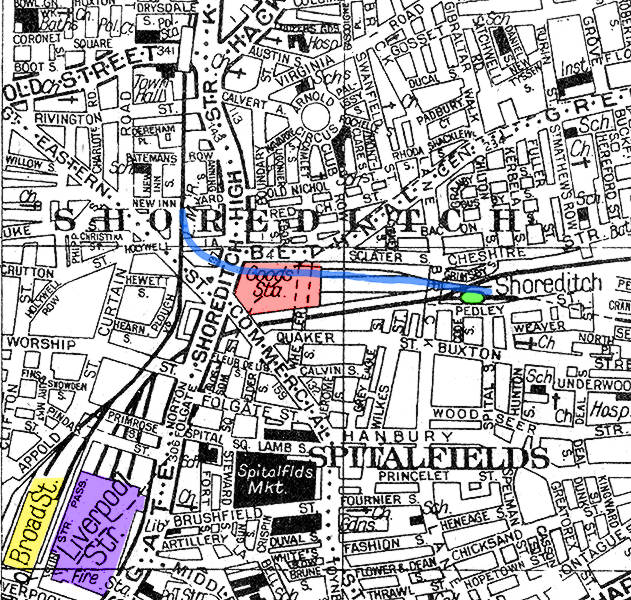 The planned closure of Shoreditch station as part of the works for the East London extension should have occurred years before it did. Indeed, the extension to Dalston Junction that caused the replacement of this station should have been completed in the year that this station was finally closed. As part of the works to extend the East London line, Shoreditch station was closed and replaced by a new Shoreditch High Street station. The route of the new line necessitated crossing over the main line tracks from Liverpool Street station, yet Shoreditch station was on the same level as those tracks. Apart from a small section where the station building is, the entire platform area has been filled in. |